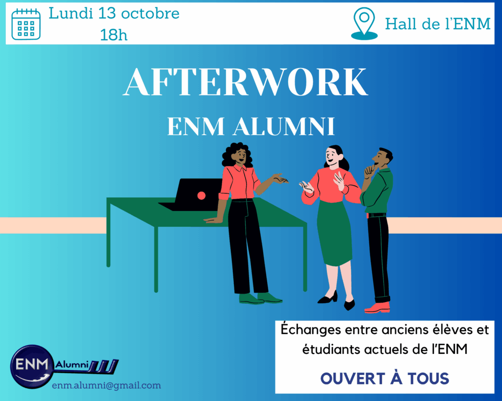Le mercredi 2 octobre 2024 aura lieu l’afterwork de rentrée d’ENM Alumni. Celui-ci se tiendra de 18h à 20h dans le hall de l’ENM.